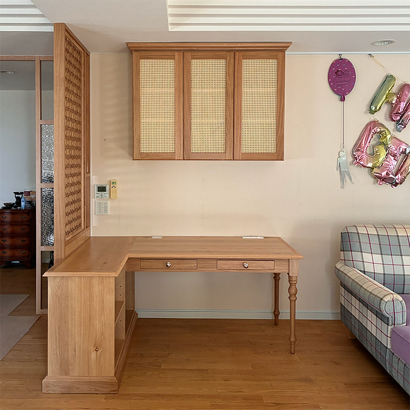 リビングにワークスペースとなるパーテーション付きのL型デスクと吊り棚を製作させて頂きました。
