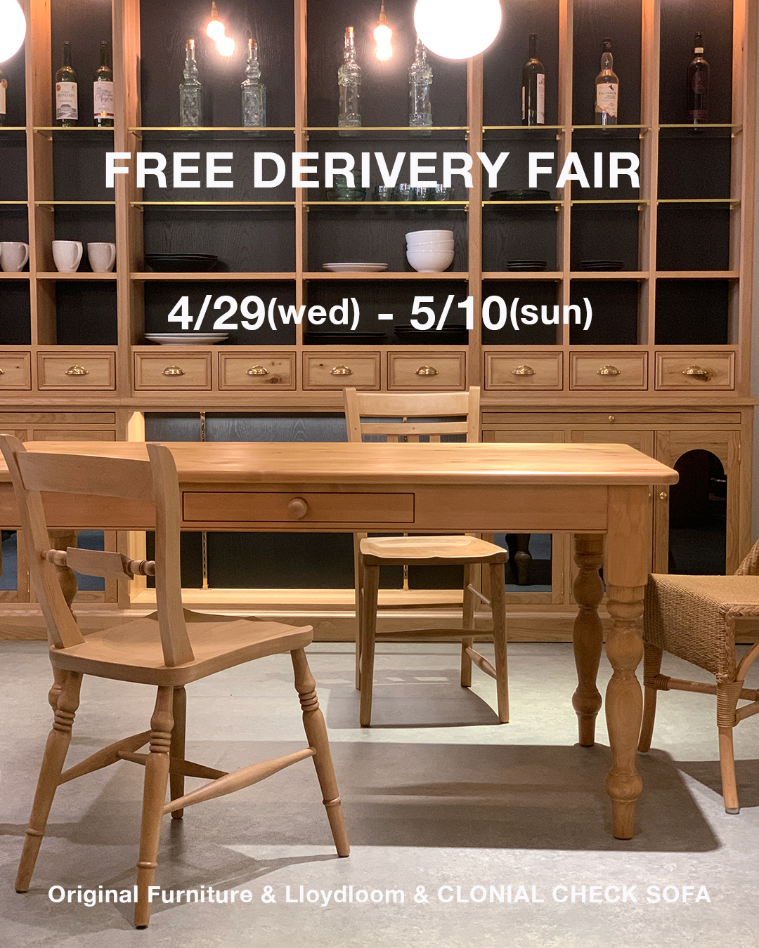 期間中は定番のオリジナルパイン家具やオーク家具、コロニアルチェックソファの新規ご注文が送料無料となります。