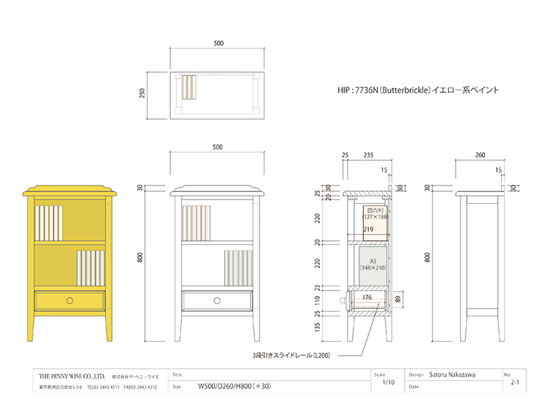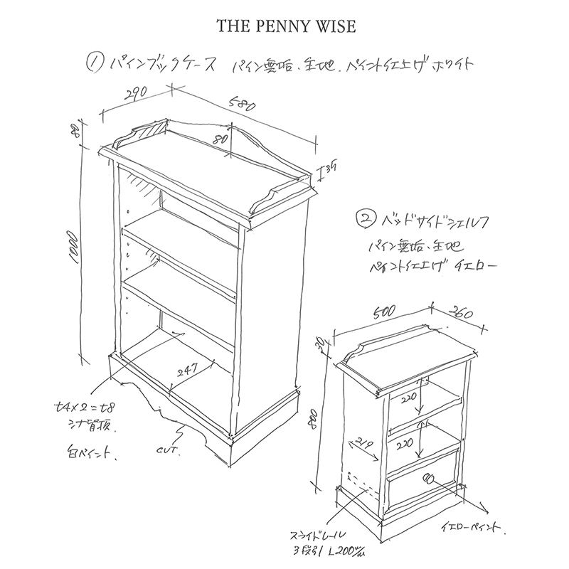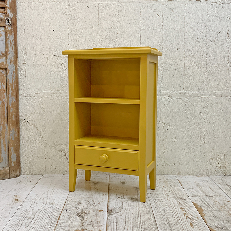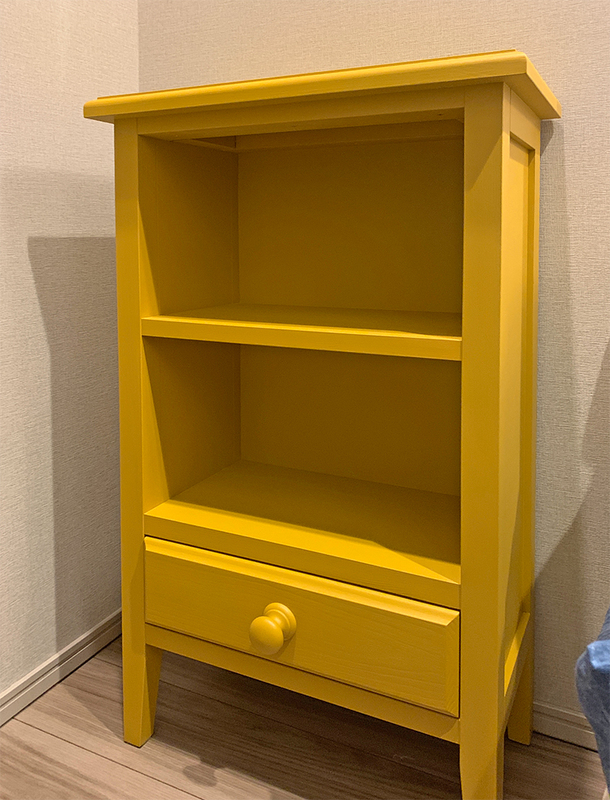 もう一台は寝室のベッド横に置く小ぶりなベッドサイドシェルフ。こちらはイエロー系のペイントをご要望。