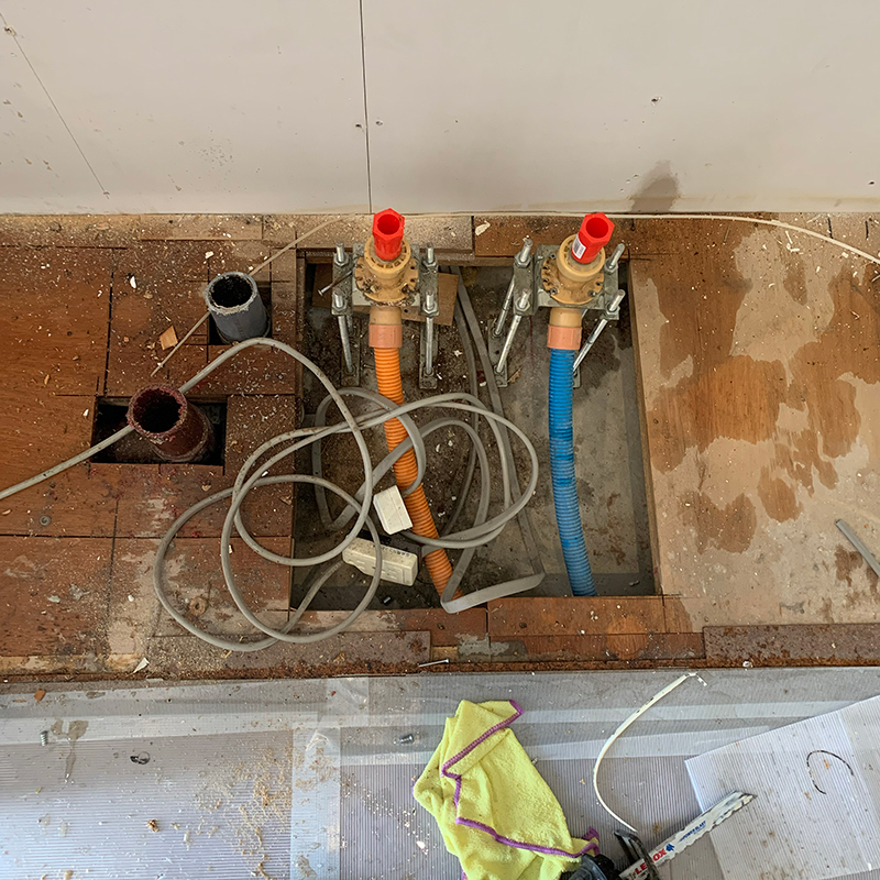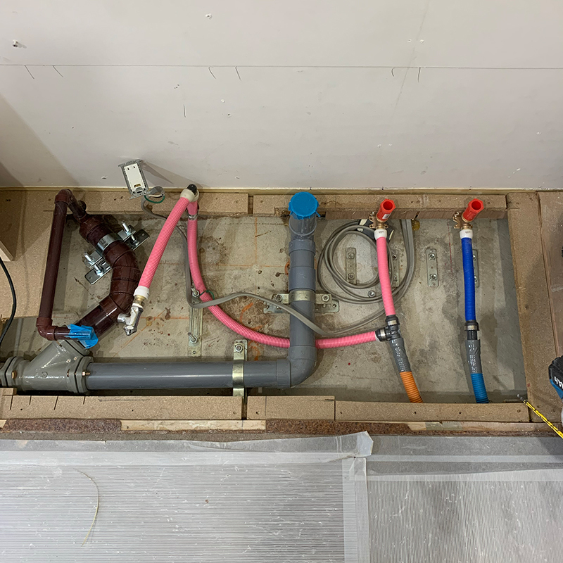 既存給水・給湯・排水の状態チェック、新しいキッチンに合わせて位置替えと気になる部分を交換。