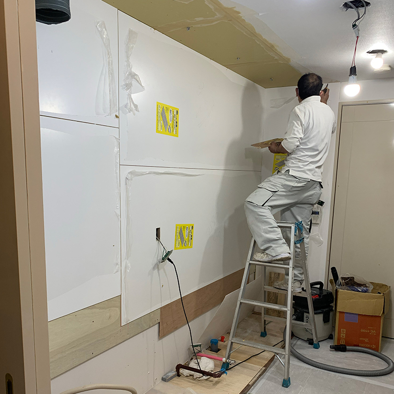 天井に新たに取り付けるペンダントライトの配線工事と壁面キッチンパネル仕上げと進めていきます。