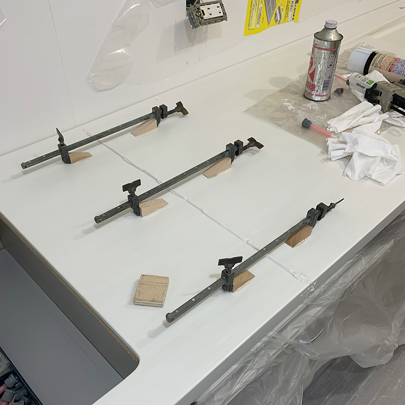 写真では分かりにくいのですが天板サイズが3365mmありエレベーターに載らず階段も廻らないため天板を分割して現場でシーム接着しています。